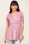 A solid short sleeve maternity top with a crossover v-neckline and smocked puff sleeves.
