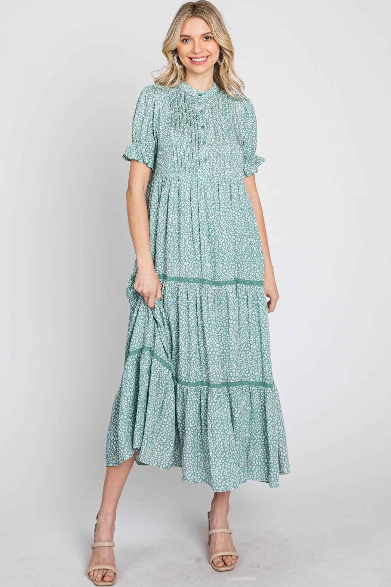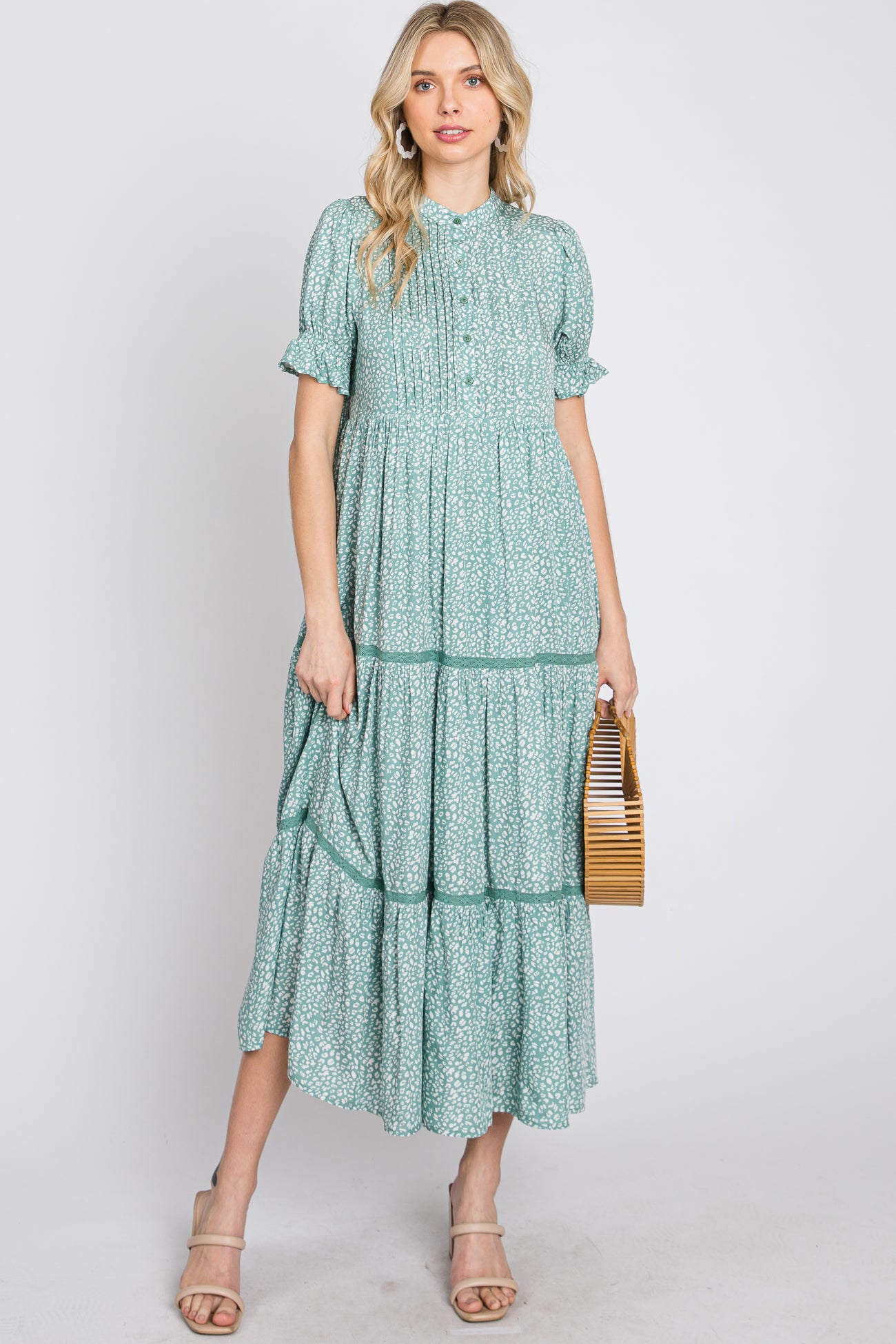 An animal print tiered midi dress featuring short puff sleeves, a button front and lace accents. Skirt is double lined.
