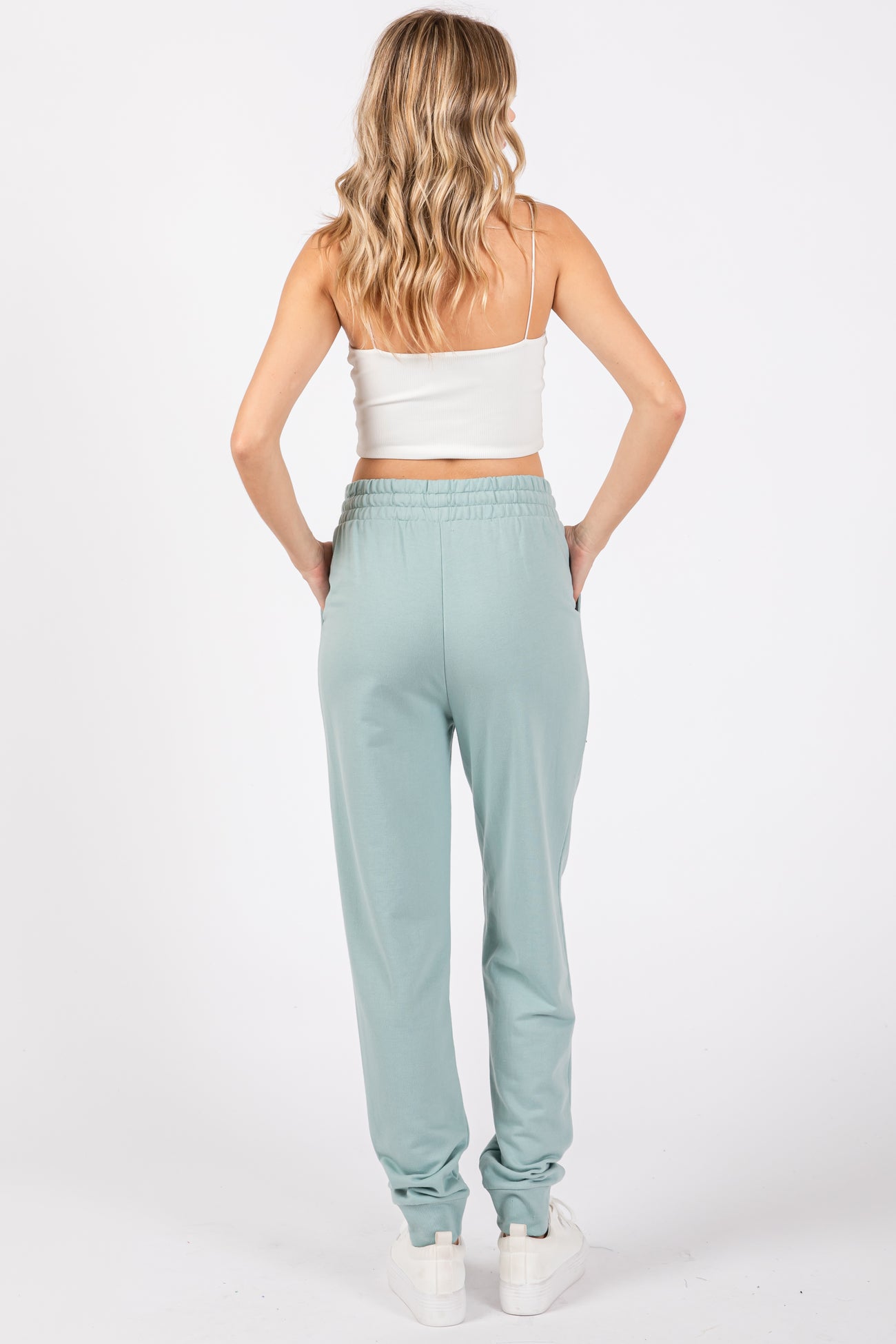 A pair of sweatpants with an drawstring waist tie, side pockets, and elastic ribbed hem