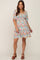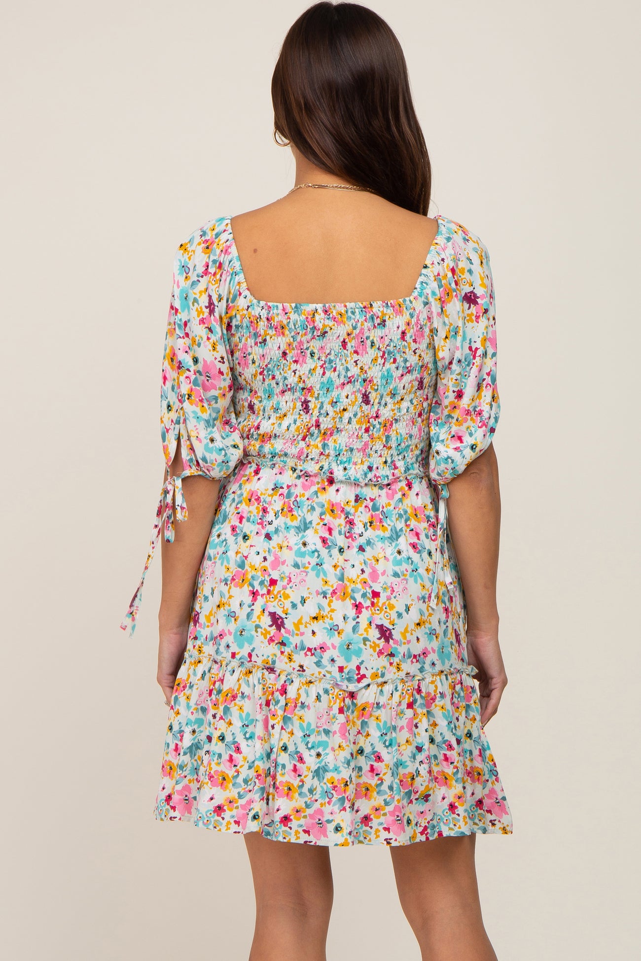 A floral printed maternity dress featuring a square neckline, a smocked elastic top, short puff sleeves with an adjustable tie, a ruffle hem and double lining.