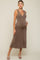A maternity midi dress featuring a v-neckline, a draped back, and an a-line skirt. Dress is lined 3/4 of the way down.