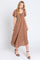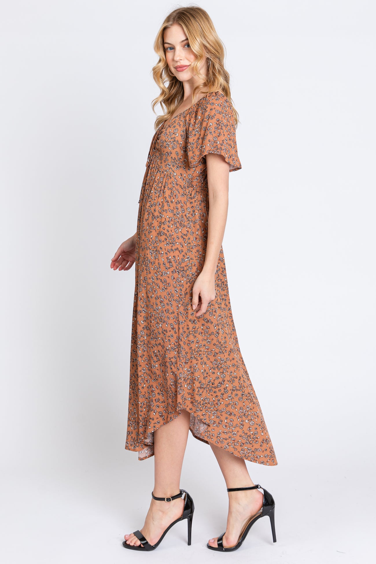 Details A floral print midi dress featuring a v-neckline, short flutter sleeves, a front ruched drawstring and a rounded hem. Content + Care