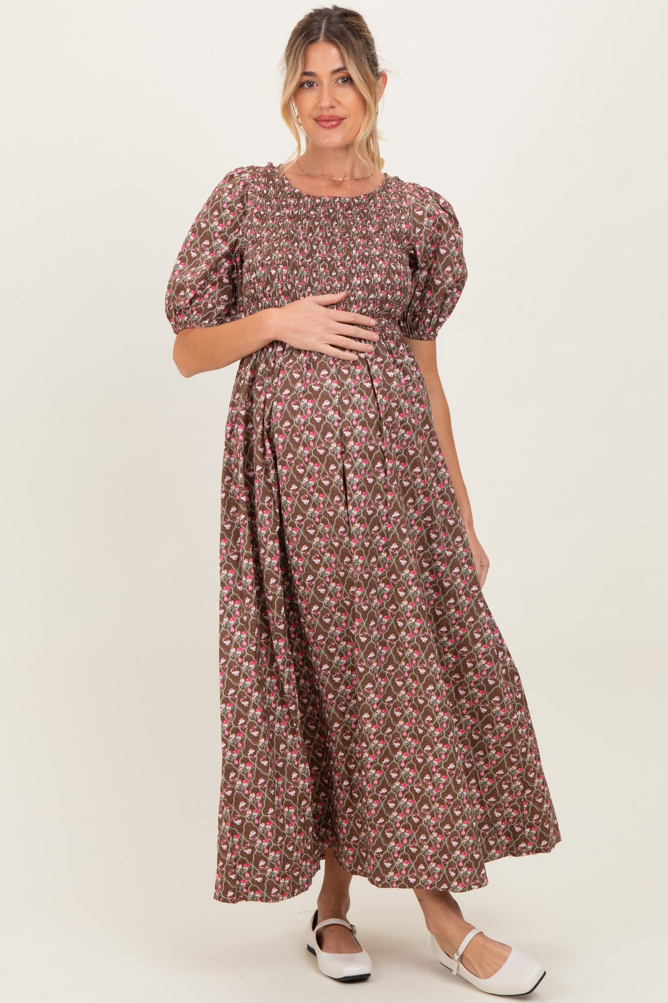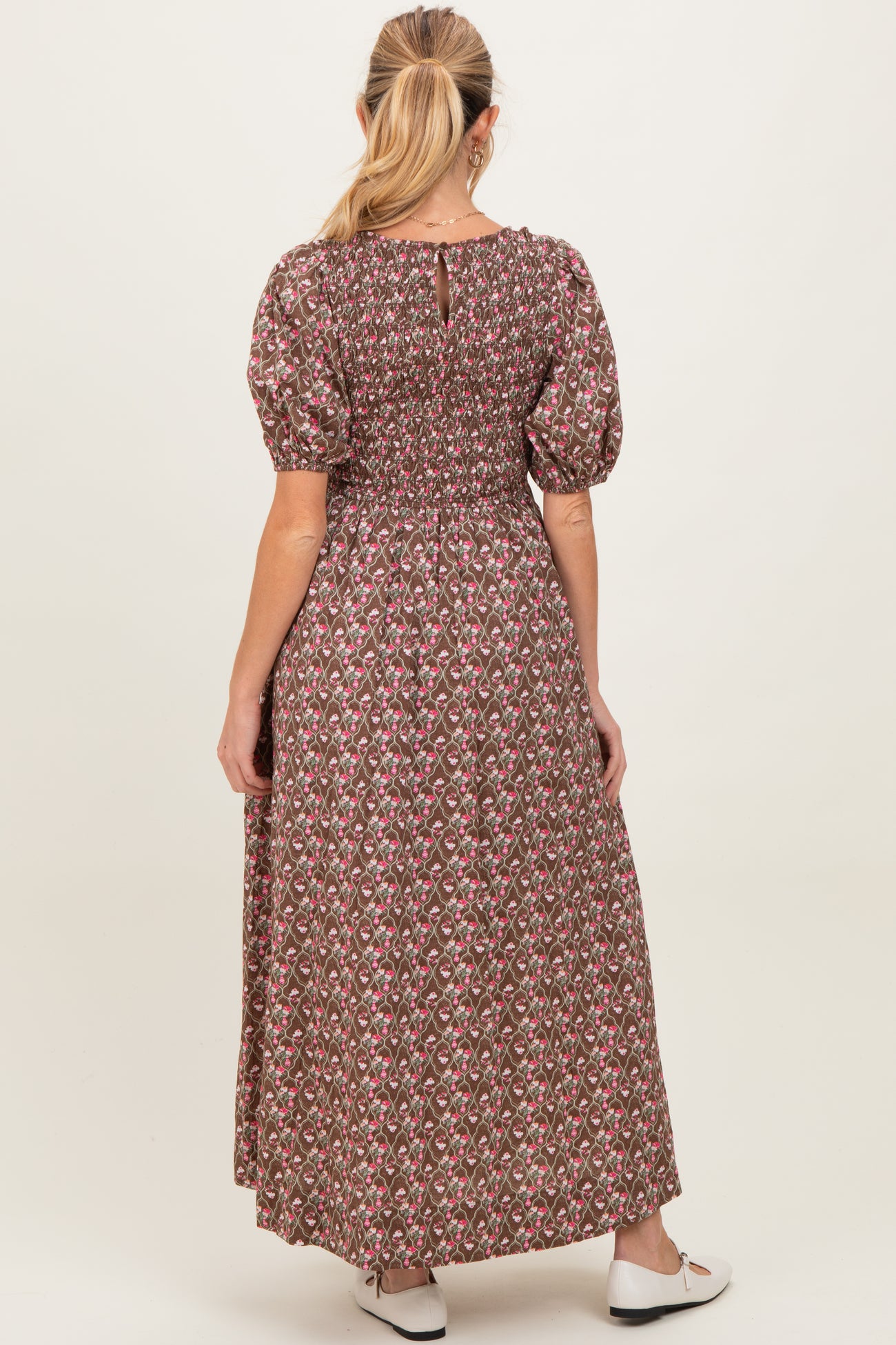 Mocha Floral Smocked Puff Sleeve Maternity Maxi Dress