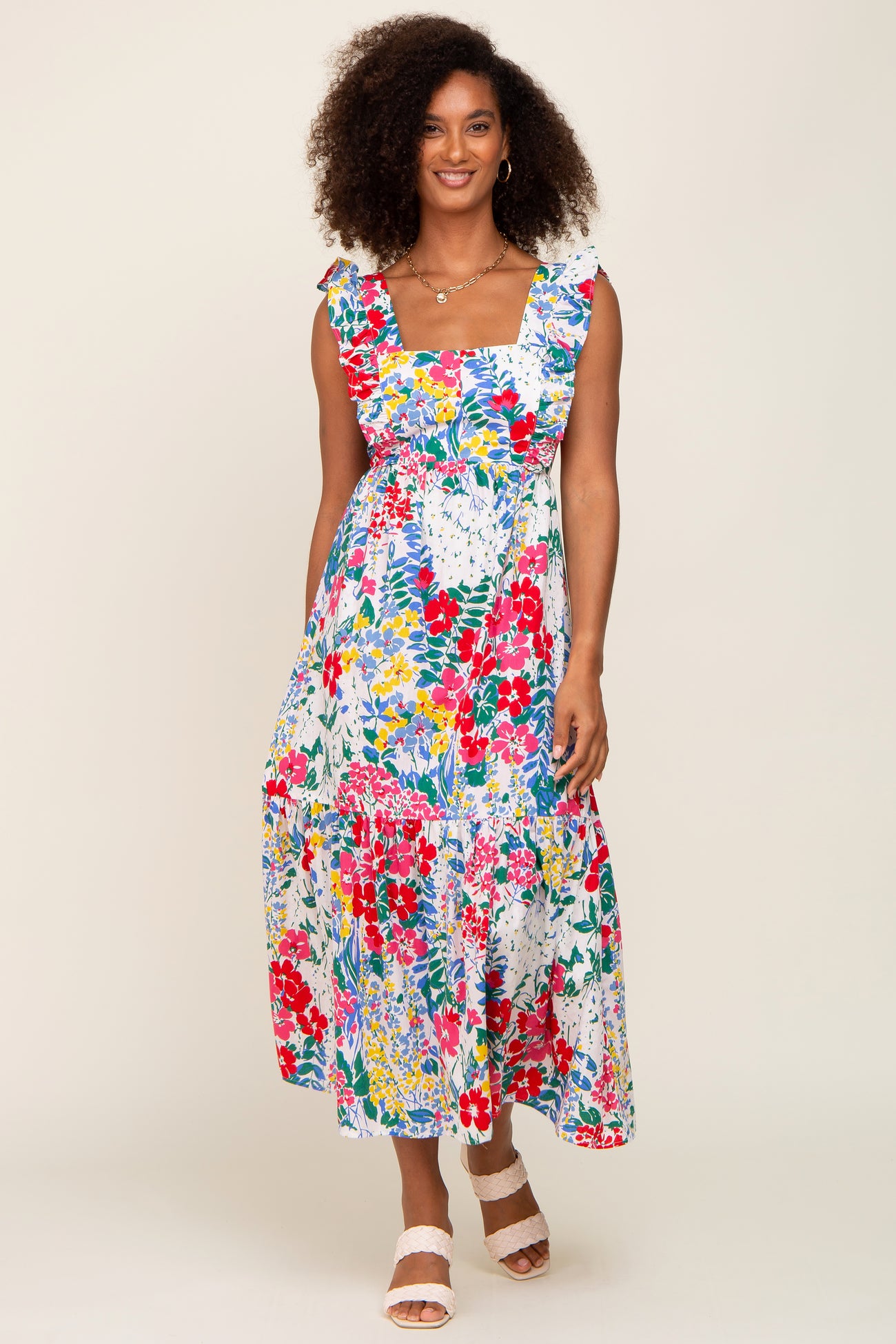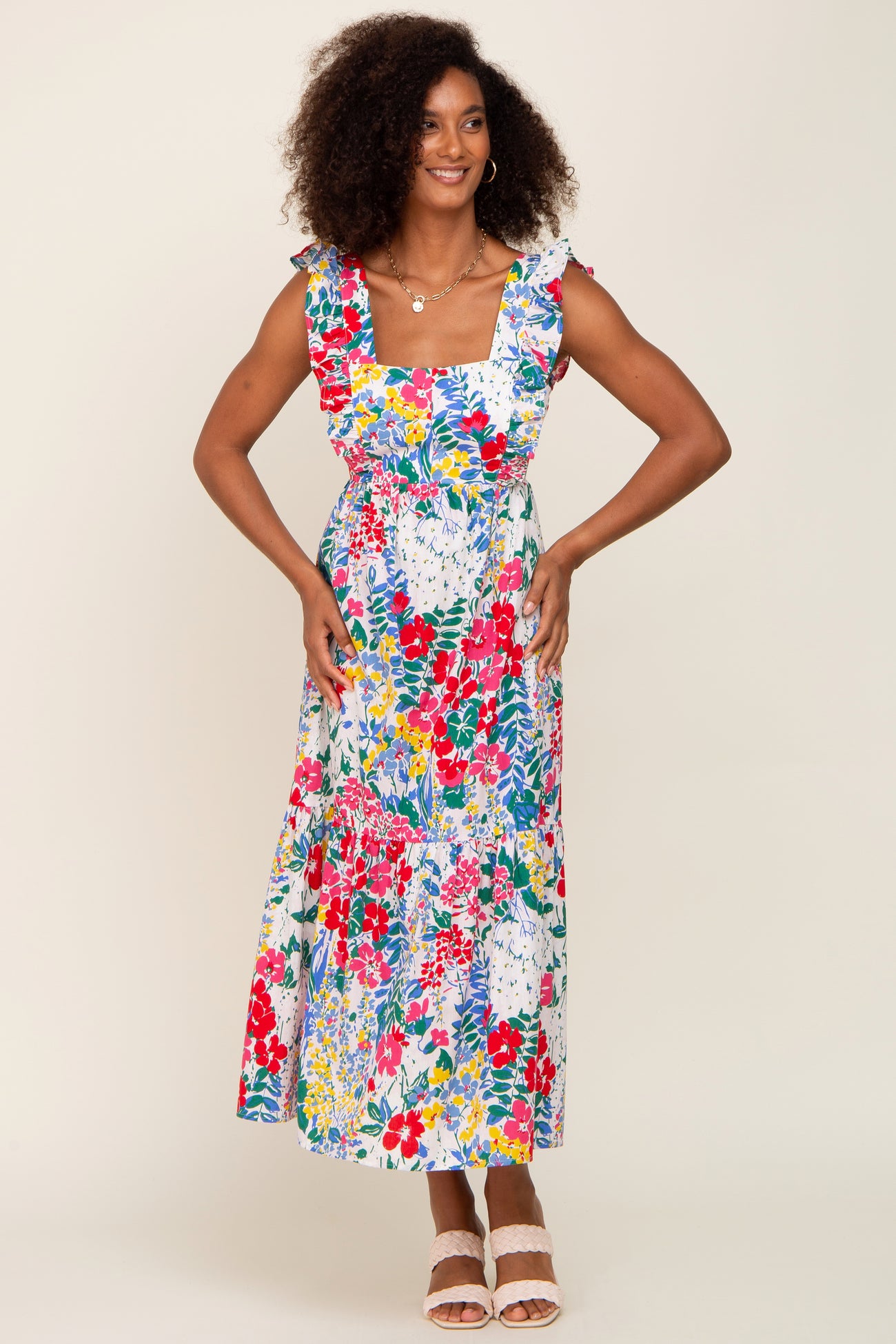 A floral print maxi dress featuring a squared neckline, ruffle accent straps, an open back, adjustable back tie, and a gathered bottom tier. Top is lined.