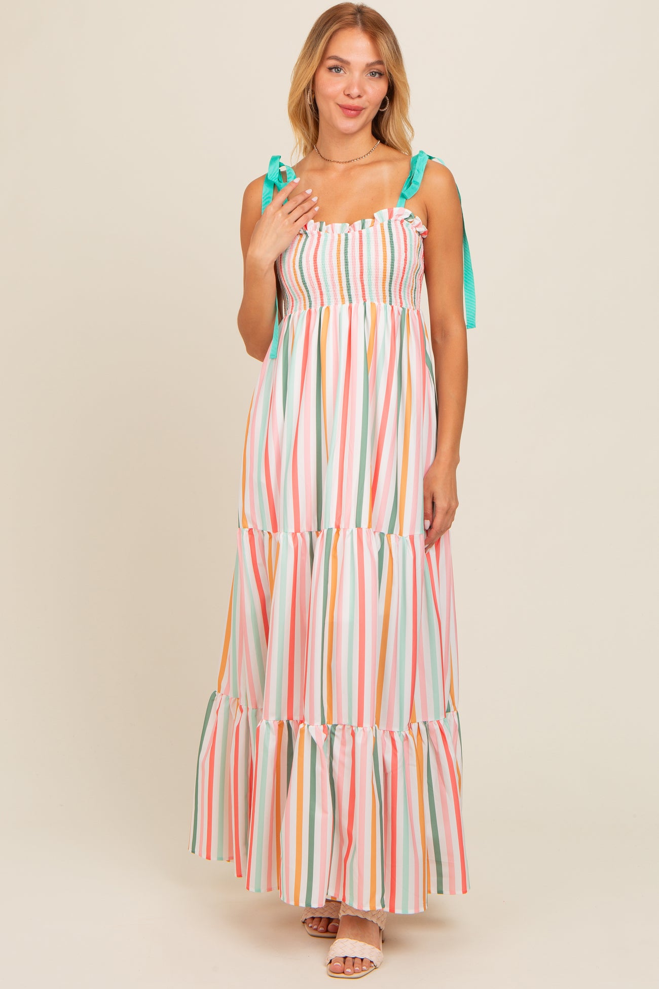 Multicolor Striped Shoulder Tie Smocked Maxi Dress