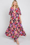 A floral print maternity maxi dress with short sleeve, deep v-neckline and tiered skirt. Hook eye closure at neckline. Dress is partially lined in skirt.