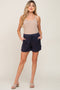 A pair of shorts featuring an elastic drawstring waist and side pockets.