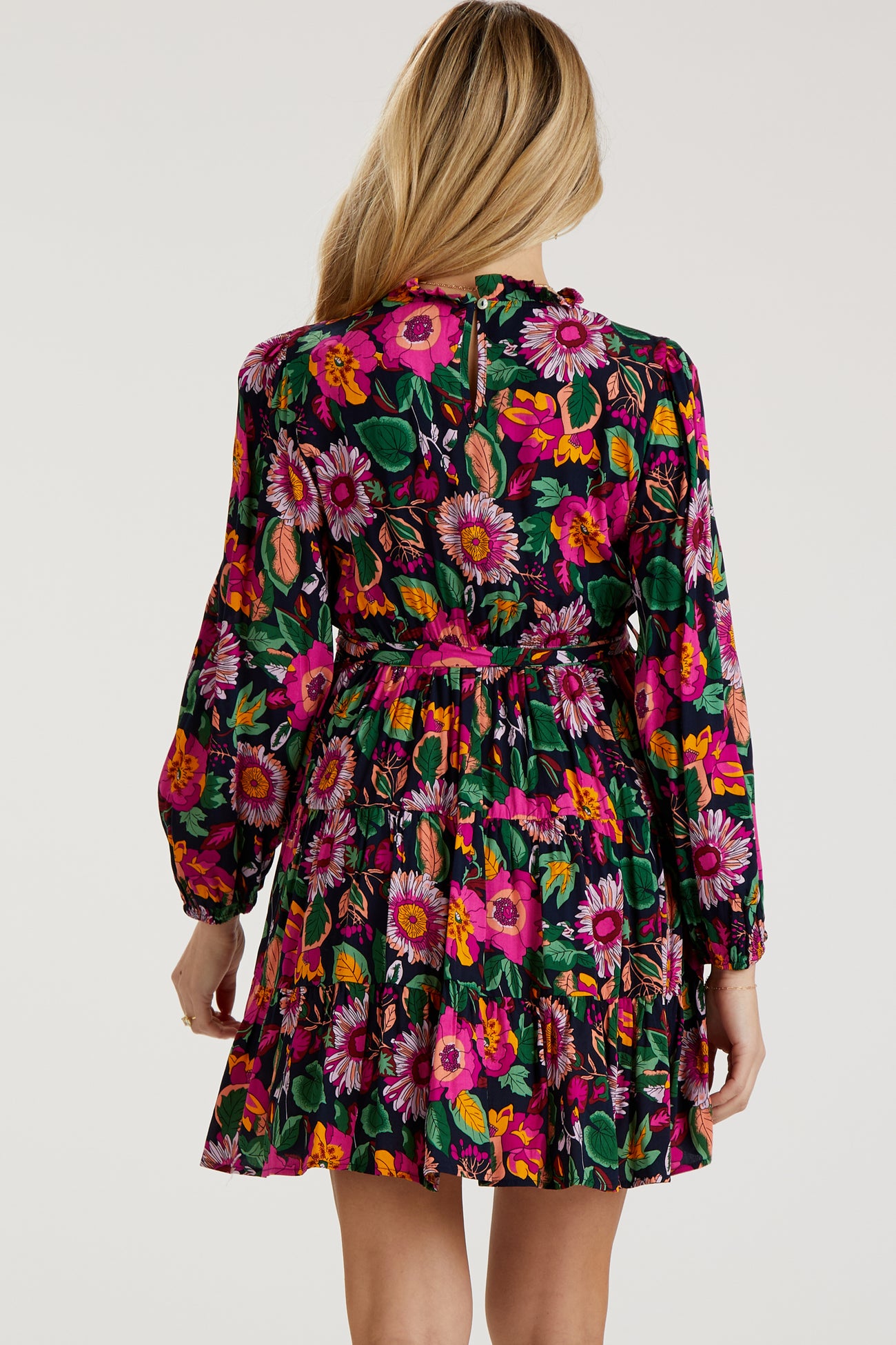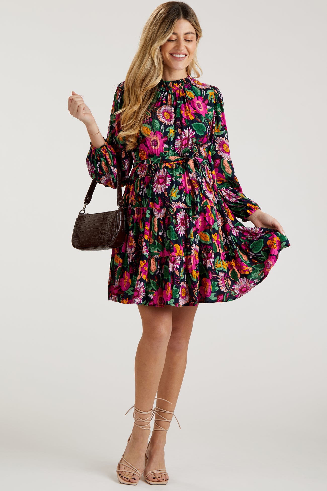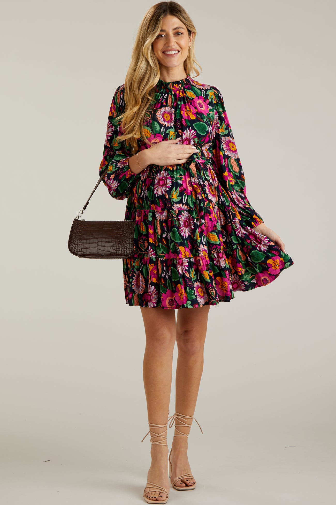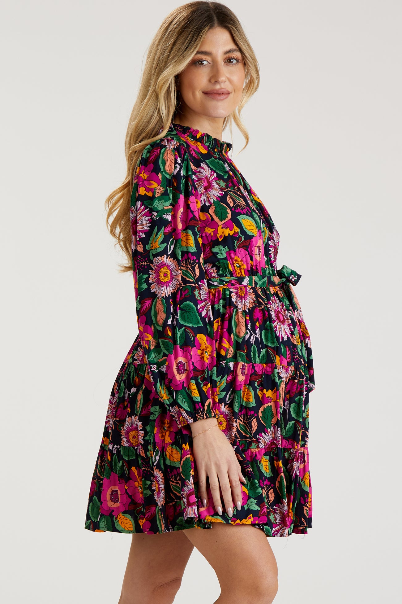 Details A floral maternity dress with long sleeves, a ruffle accent mock neck, an elastic waist with a waist tie, side pockets, a tiered skirt, and a back keyhole button closure. Content + Care