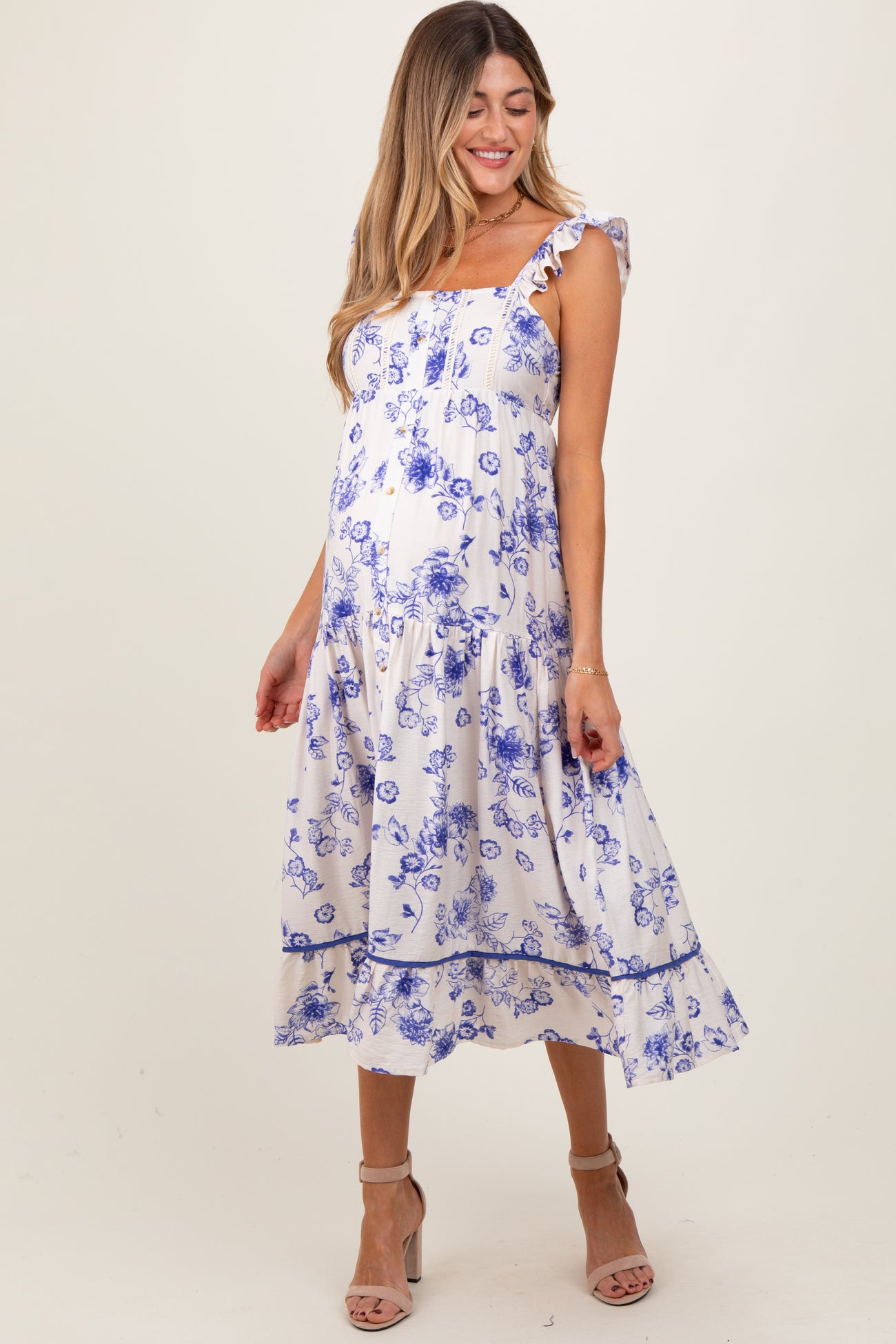 Navy Floral Ruffle Strap Tiered Maternity Midi Dress