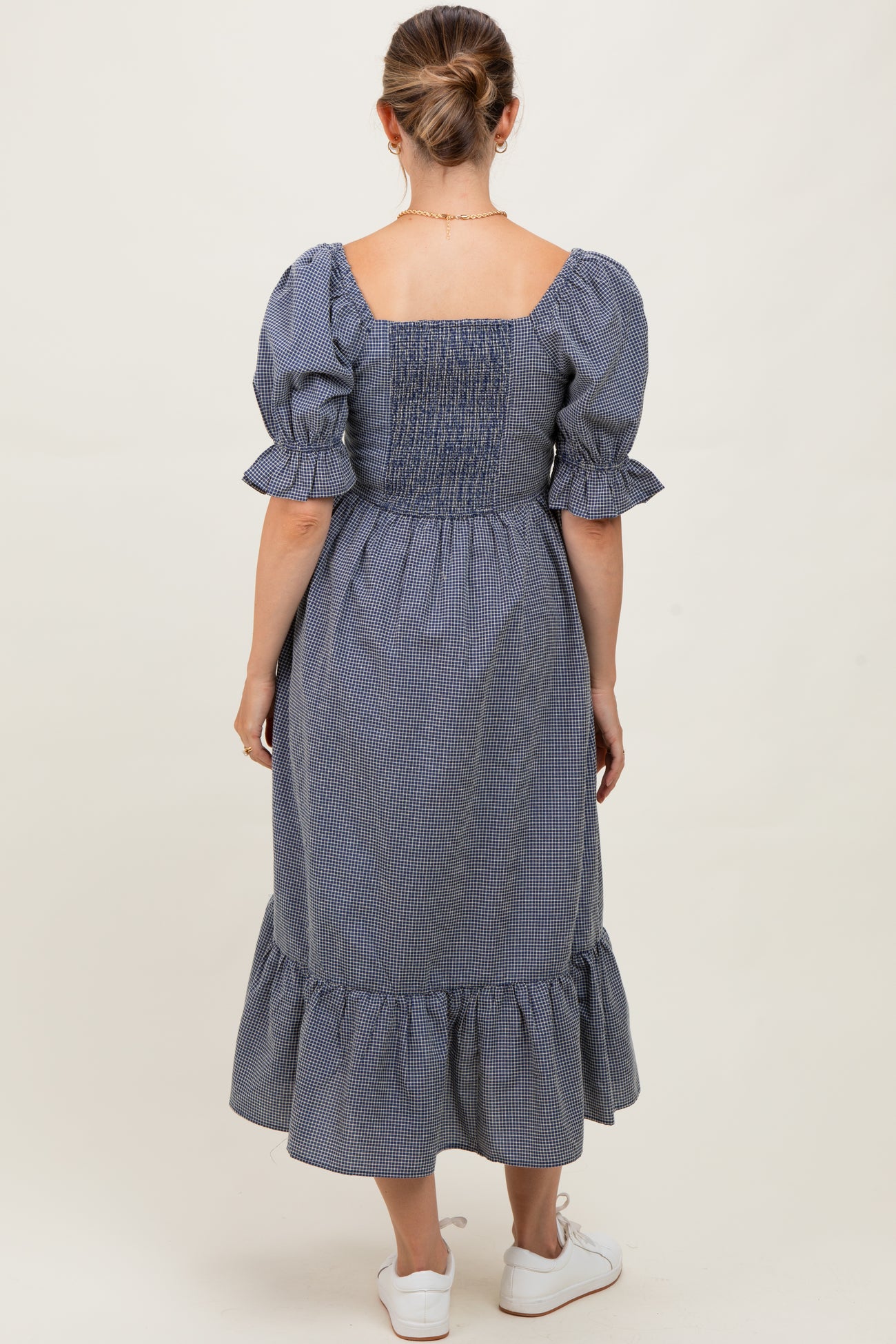 Experience effortless style and comfort with our Navy Gingham Square Neck Maternity Midi Dress. Designed with a flattering square neckline and charming puff sleeves, this dress offers a timeless silhouette that hugs your bump beautifully. The lightweight gingham fabric keeps you cool and comfortable, while the elasticized waist and flowy midi skirt provide ample room for your growing belly. Perfect for casual outings or special occasions, pair it with sneakers or sandals for a versatile maternity look. Embrace your pregnancy glow with this chic, breathable dress made for every trimester.