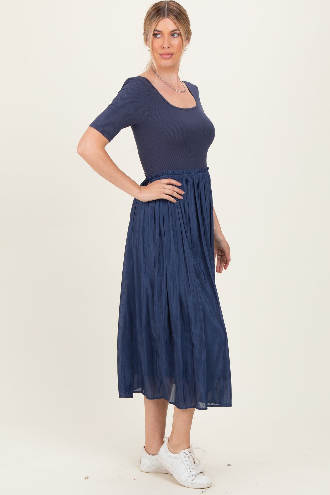 Embrace timeless elegance with our Navy Scoop Neck Pleated Skirt Ballet Dress. Featuring a flattering scoop neckline and fitted bodice, this dress seamlessly combines comfort and style. The flowing pleated skirt adds a soft, graceful movement reminiscent of classic ballet, making it perfect for any occasion from casual outings to evening events. Crafted from lightweight, breathable fabric, it offers all-day comfort while maintaining a polished look. Pair with your favorite flats or heels for a sophisticated, effortlessly chic ensemble. Available in versatile navy to complement every wardrobe. Perfectly feminine and forever fashionable.