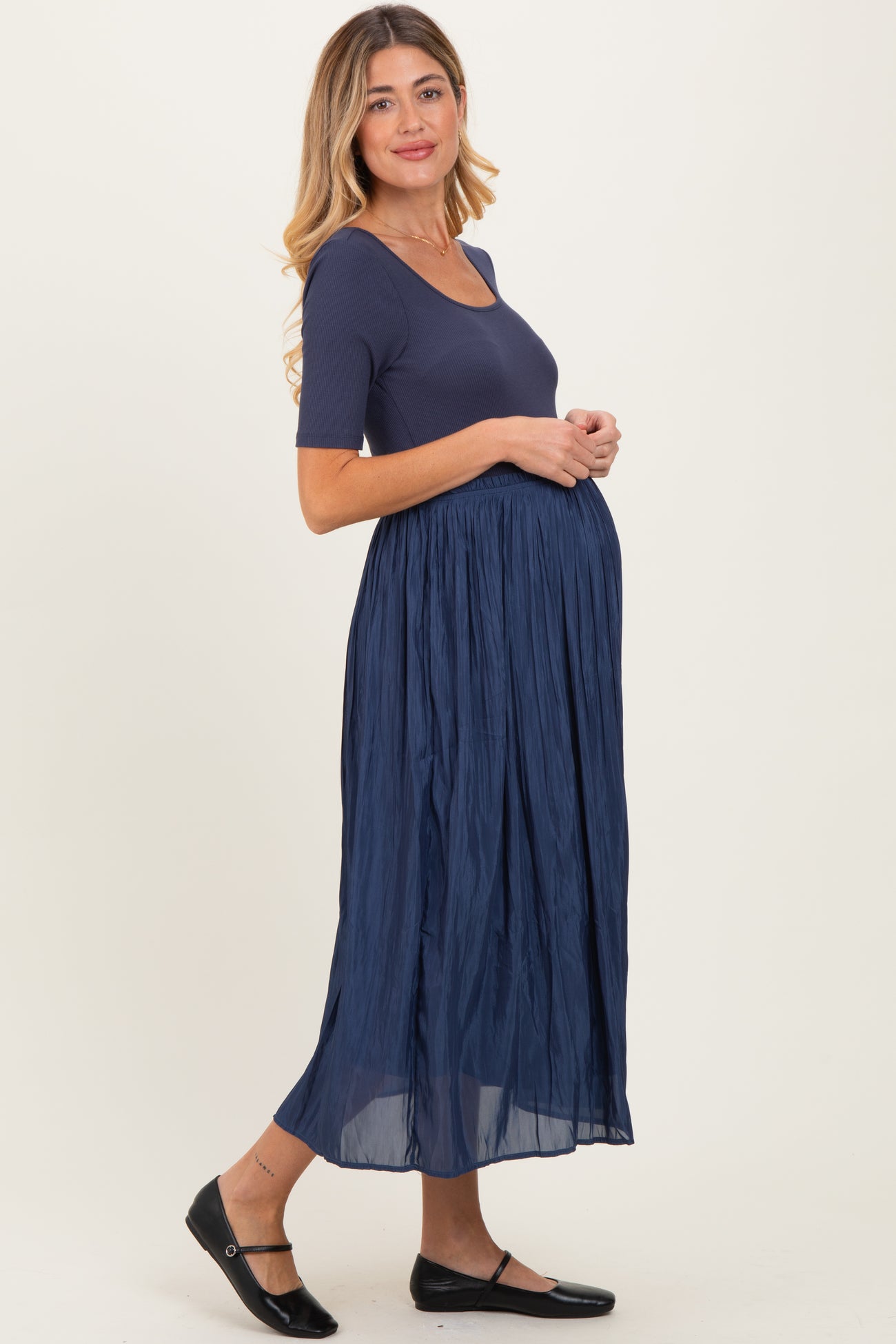 Navy Scoop Neck Pleated Skirt Ballet Maternity Dress