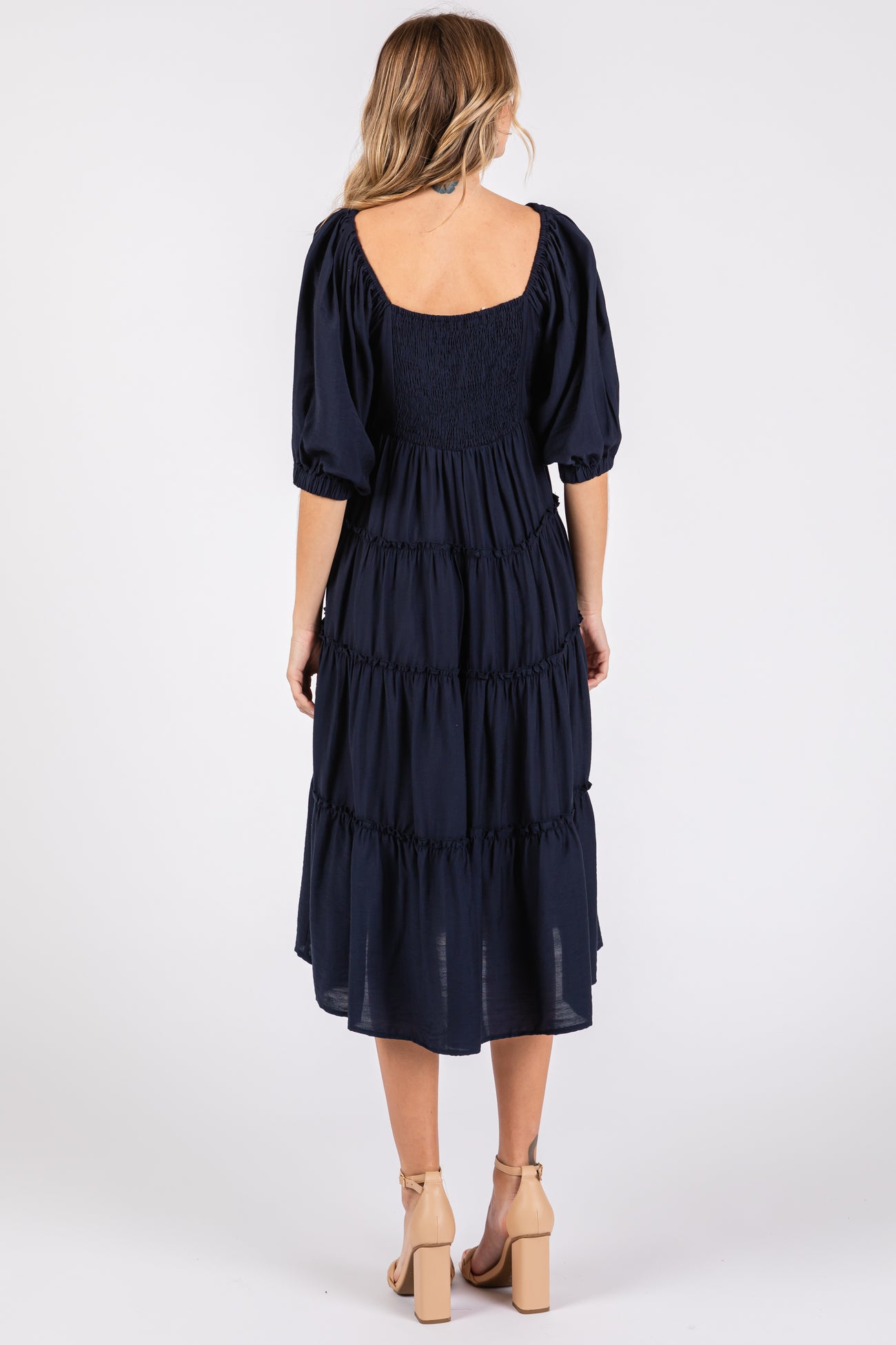 A solid hued midi dress featuring short sleeves, a tiered body and a self-tie neckline.