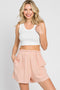 A pair of washed maternity shorts featuring a cuffed hem, a self-tie drawstring waist and front pockets.