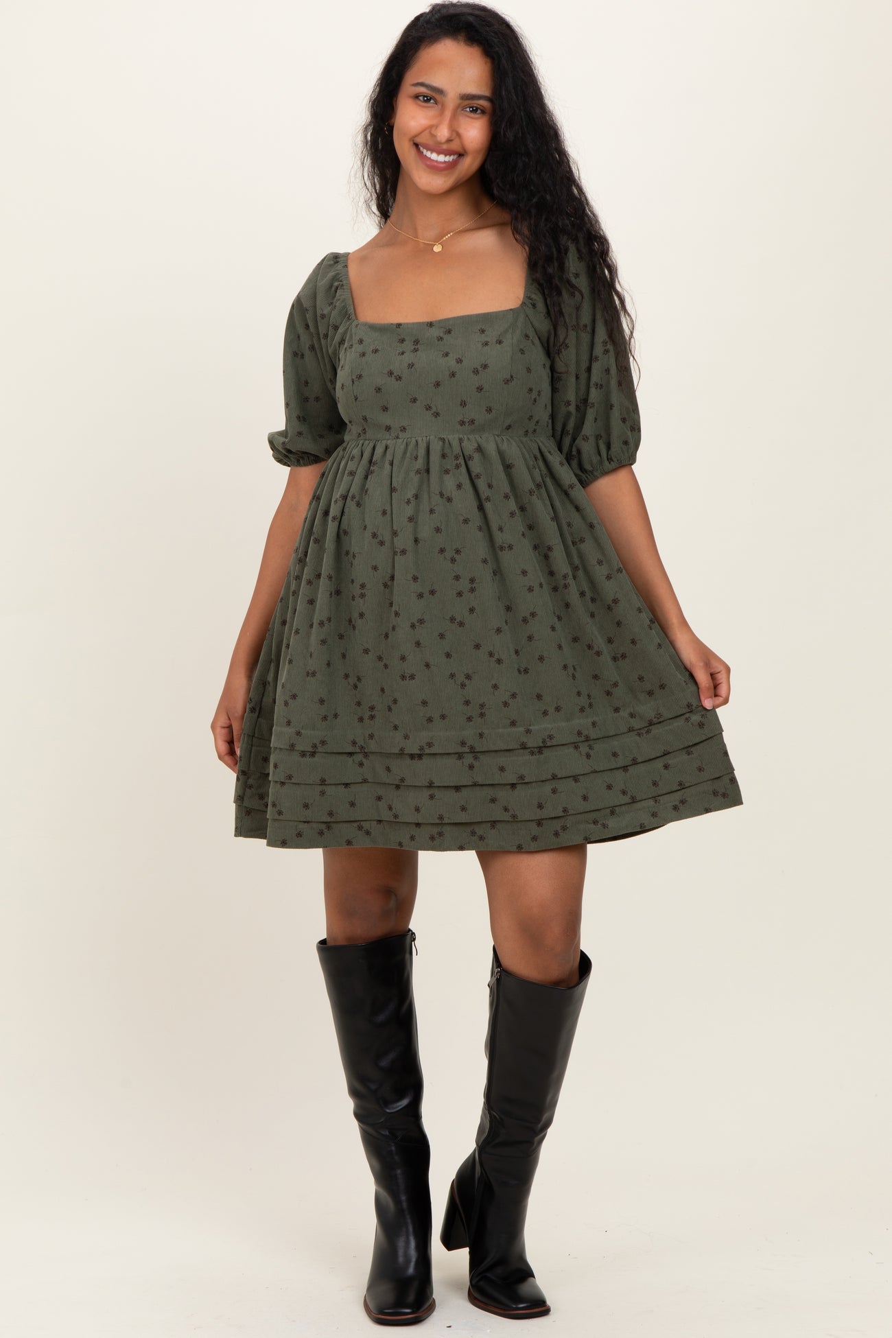 Olive Floral Corduroy Puff Sleeve Babydoll Mini Maternity Dress