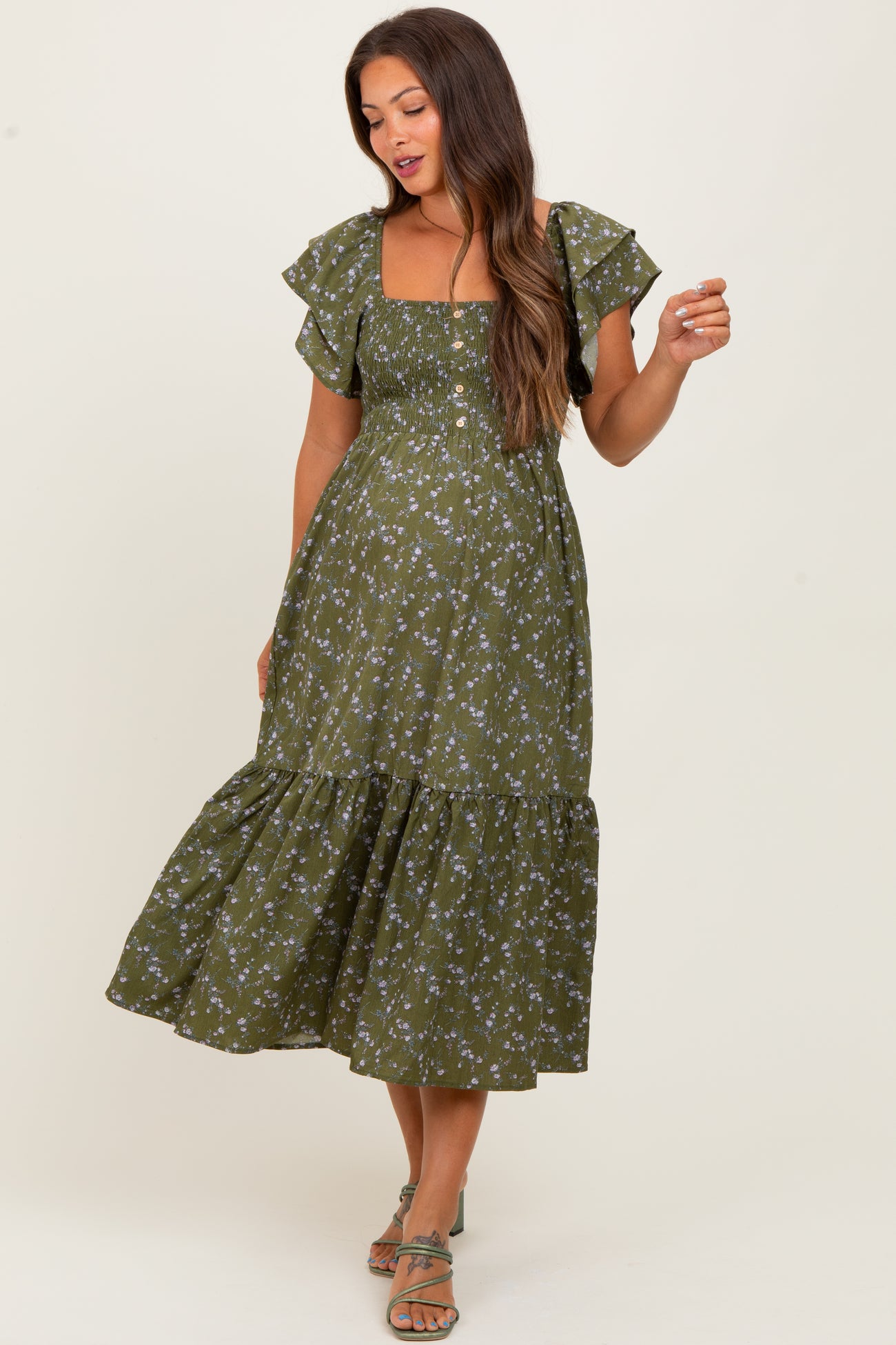 Olive Floral Smocked Flutter Sleeve Maternity Midi Dress