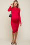 A solid fitted ruched midi dress with front cutout and strap details. Dress is lined.