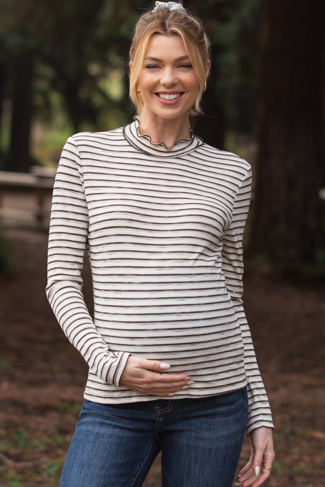 Elevate your maternity wardrobe with our Olive Striped Ribbed Mock Neck Ruffle Hem Top. Crafted from soft, stretchy fabric, this long-sleeve top offers ultimate comfort and a flattering fit that moves with your growing bump. The subtle olive stripes add a touch of timeless style, while the delicate ruffle hem and mock neck detail give it a chic, feminine edge. Perfect for layering or wearing on its own, this versatile top pairs easily with jeans or maternity leggings for casual days or dressier outings. Embrace cozy style and confidence throughout your pregnancy with this must-have maternity essential.