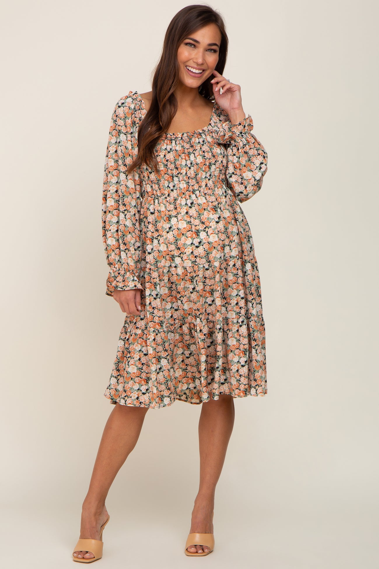 Peach Floral Smocked Square Neck Tiered Maternity Dress