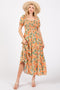 Peach Floral Square Neck Short Puff Sleeve Lace-Up Back Maternity Midi Dress