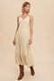 An ombre hued, ruffle tiered maternity midi dress featuring a square neckline with ruffle trim, adjustable tie straps and double lining.