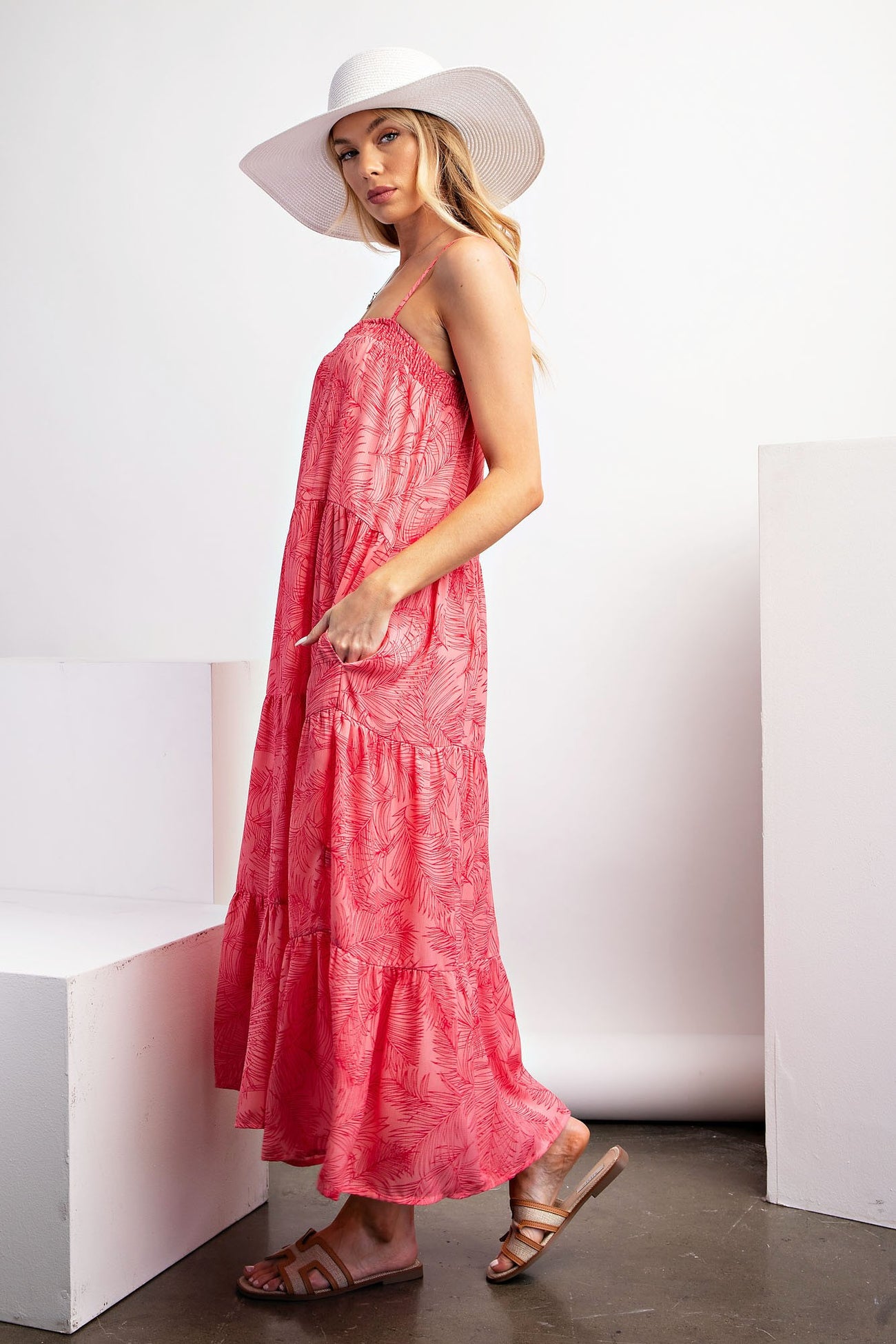 Pink Coral Leaf Printed Peach Blossom Tiered Cami Dress