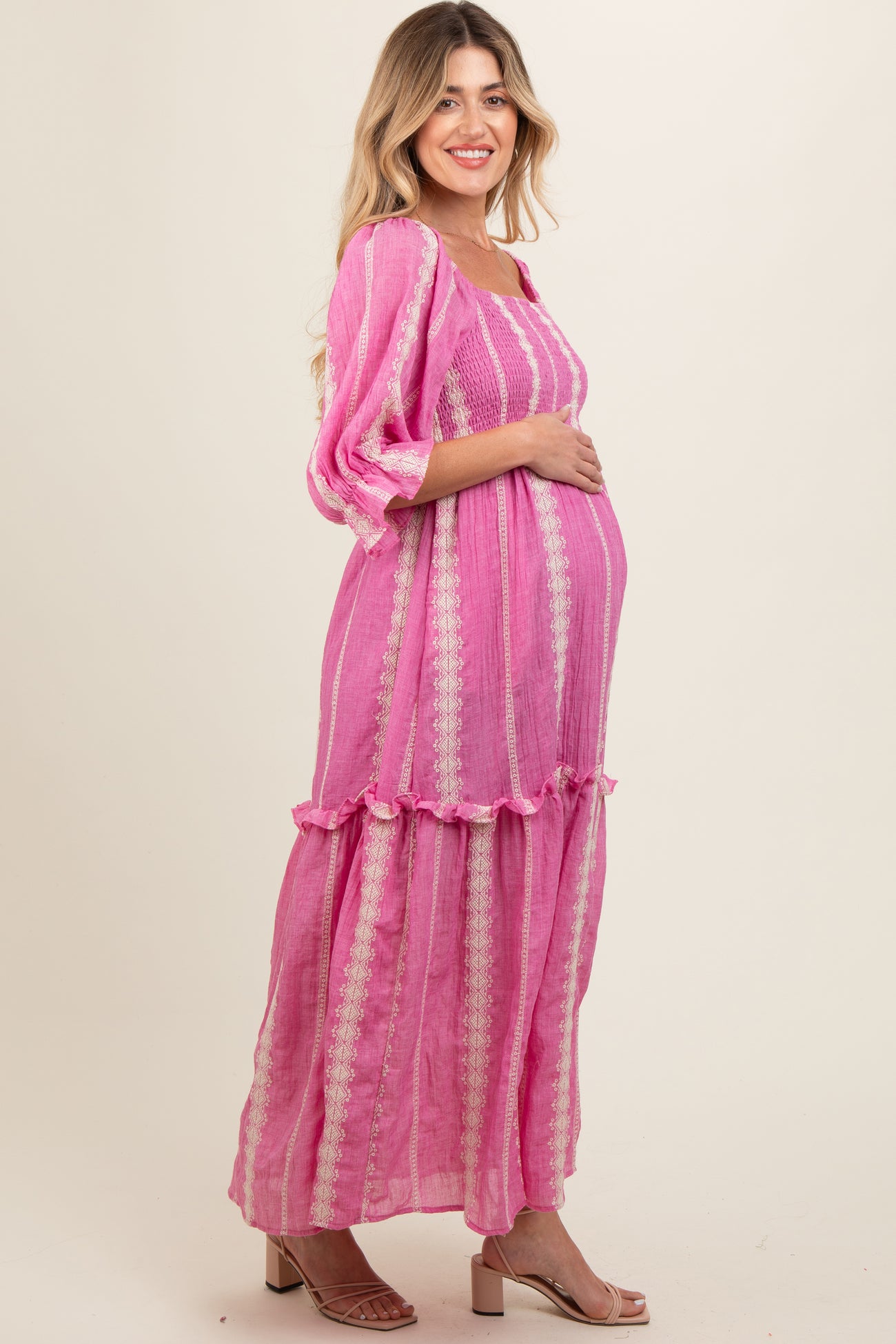 Pink Embroidered Detail Smocked Top Maternity Maxi Dress