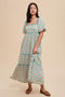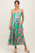 A satin leaf print midi dress featuring a square neckline, adjustable cami straps, a back zipper, an empire waist and double lining.