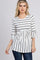 A striped peplum top featuring 3/4 ruffle trim sleeves, and a rounded neckline.