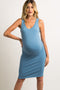 A sleeveless maternity dress featuring a solid hue, a rounded neckline, and ruching on the sides for a form-fitting silhouette.
