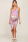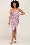 A printed maternity midi dress featuring a cowl neckline, adjustable ties at the shoulders, a front adjustable drawstring with a slit.