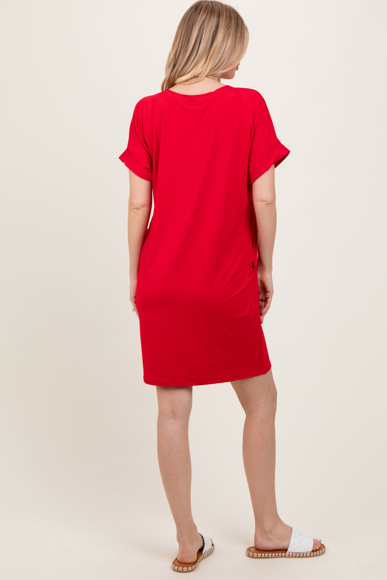 Red Brushed Rolled Short Sleeve V-Neck Dress
