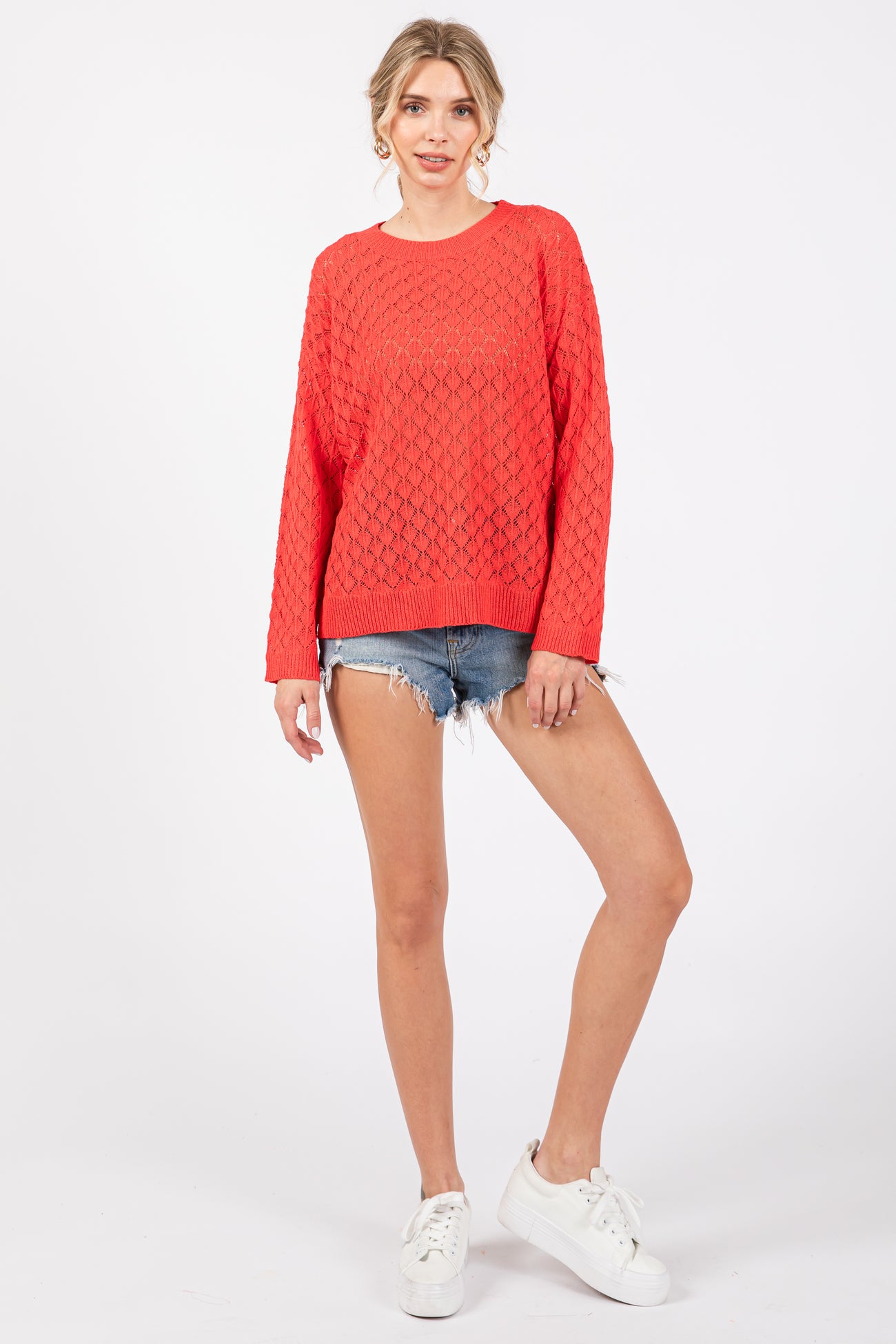 A solid lightweight long sleeve knit top with open diamond design. Top is semi sheer.