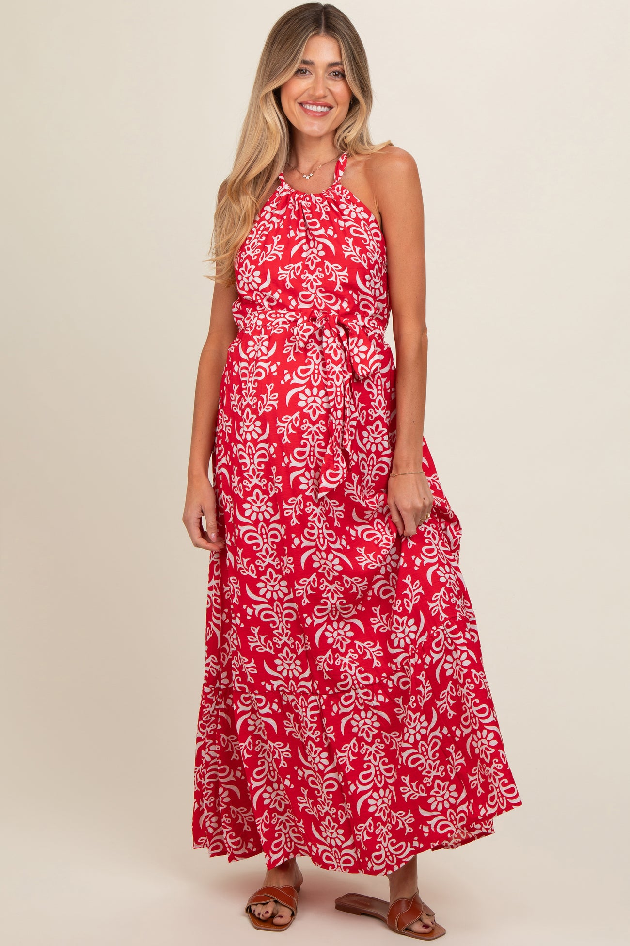 Red Paisley Halter Cross Back Maternity Maxi Dress