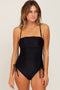 A solid hued one-piece maternity swimsuit featuring ruched front ties at hips that can be adjusted, a square neckline, adjustable straps, removeable padded cups, built in bra, metal buckle clasp closure, U shaped cutout on back, and a double lining.