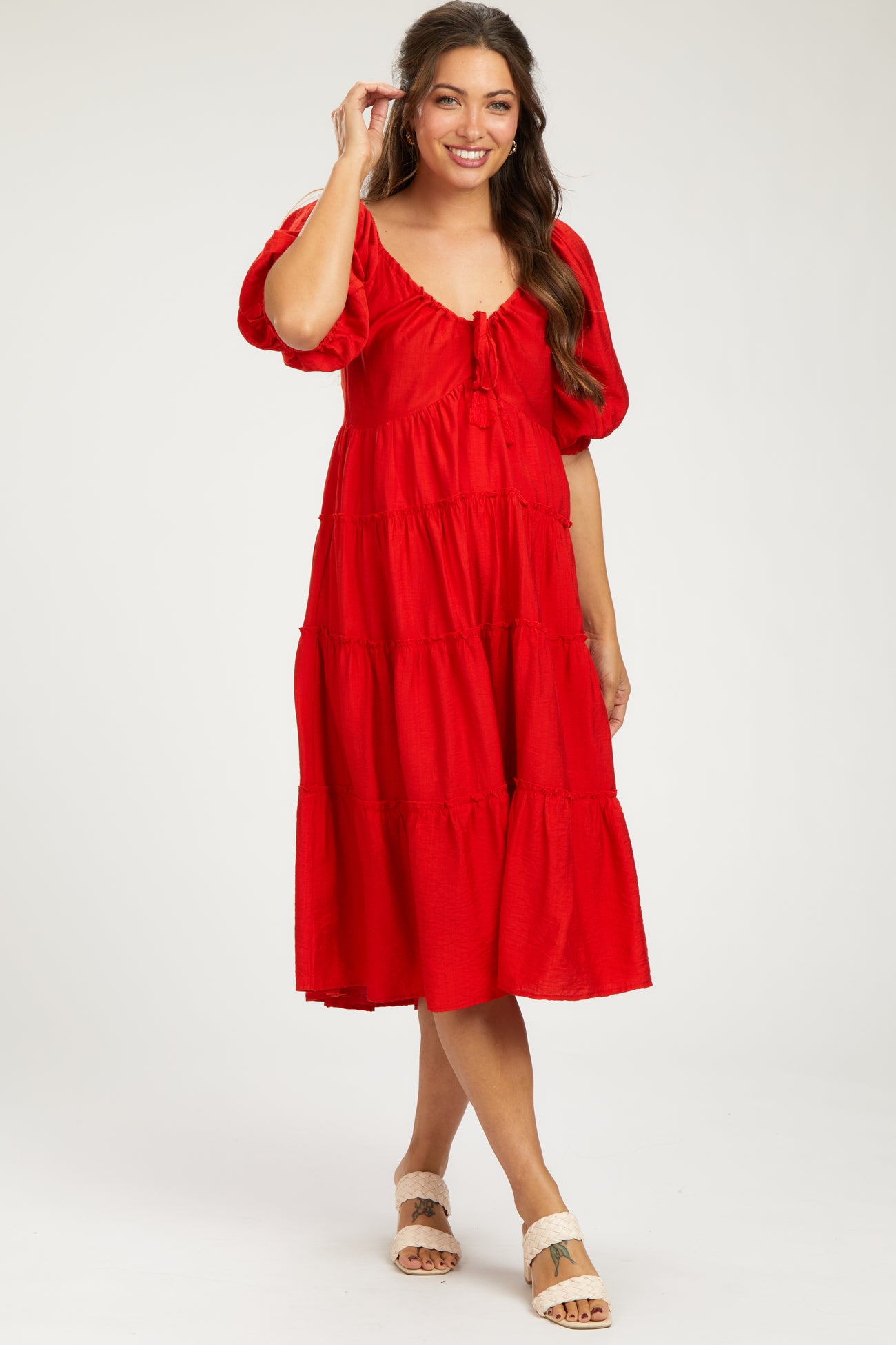 A solid hued maternity midi dress featuring short sleeves, a tiered body and a self-tie neckline.