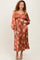 Rust Satin Floral Bubble Sleeve Midi Dress