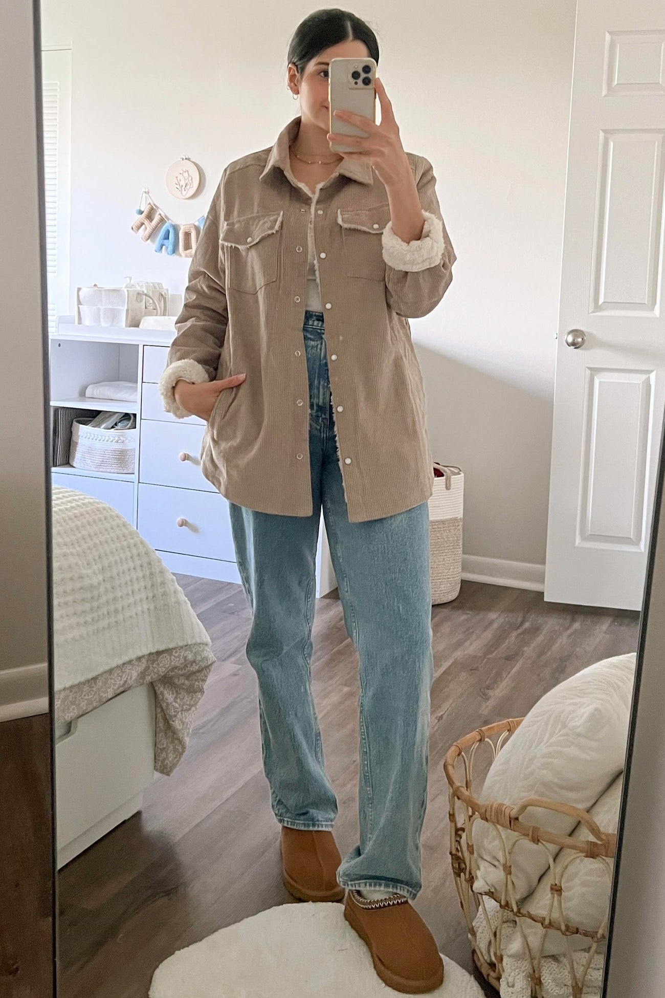 Details A corduroy, sherpa lined shacket featuring long sleeves, a snap button down front, two front pockets with a snap button closure and a round hem. Content + Care