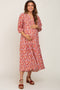 A leaf print maxi with a ruffled v-neckline, short puff sleeves, a cinched front tie, smocked back, and side pockets.