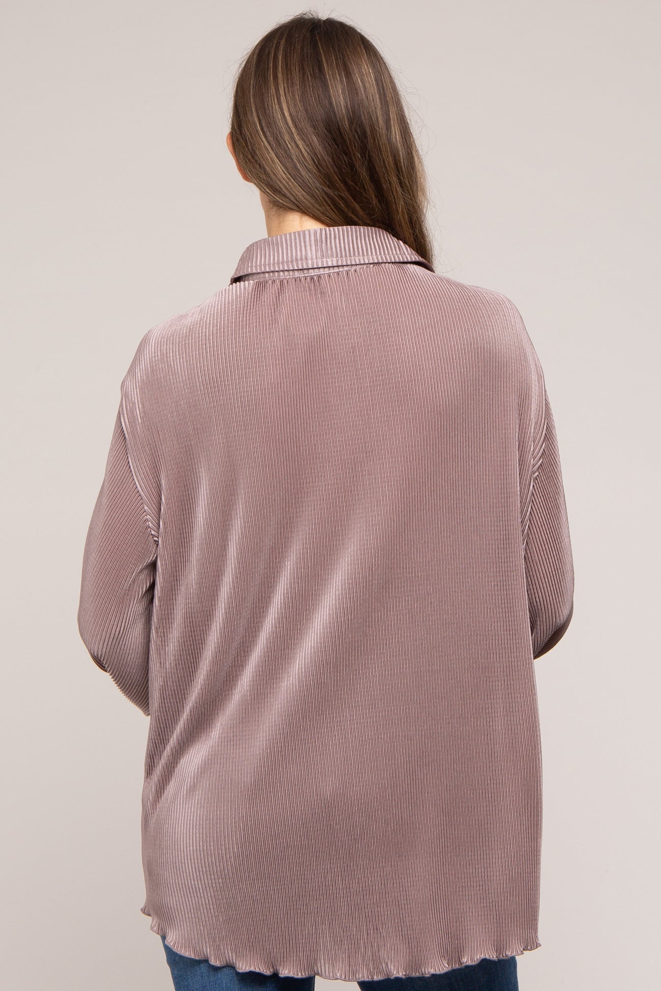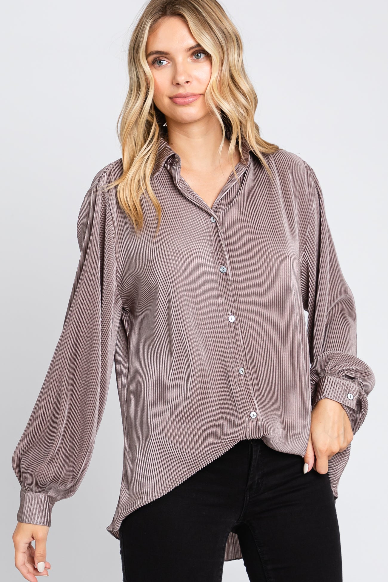 Taupe Plisse Button Up Long Sleeve Maternity Top