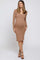 A rib knit maternity dress with a scoop neckline and long sleeves. Body is lined