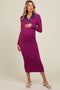 A ribbed sleeveless maternity dress featuring side ruching, a side slit and a rounded neckline.