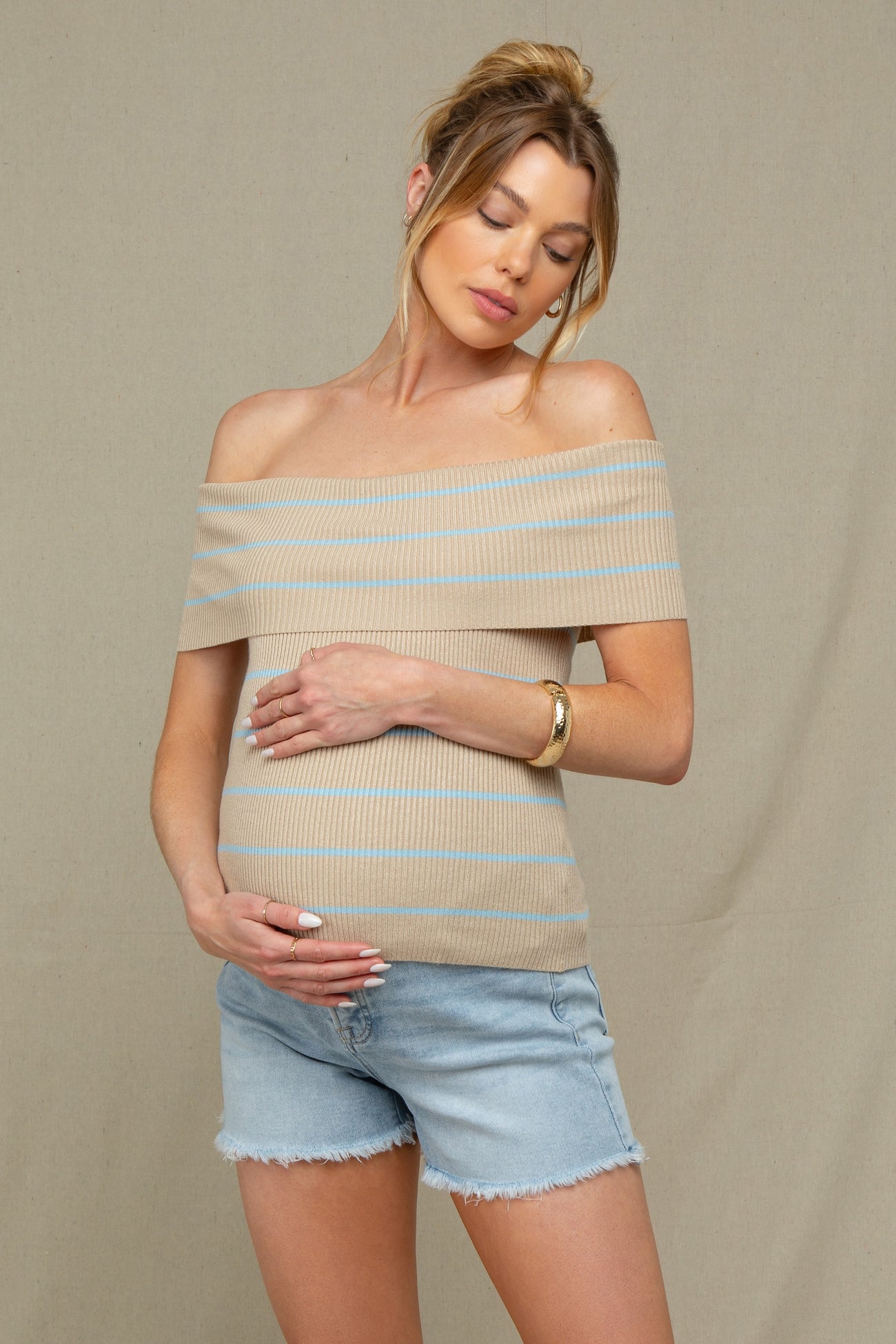 Taupe Striped Off The Shoulder Sweater Maternity Top