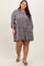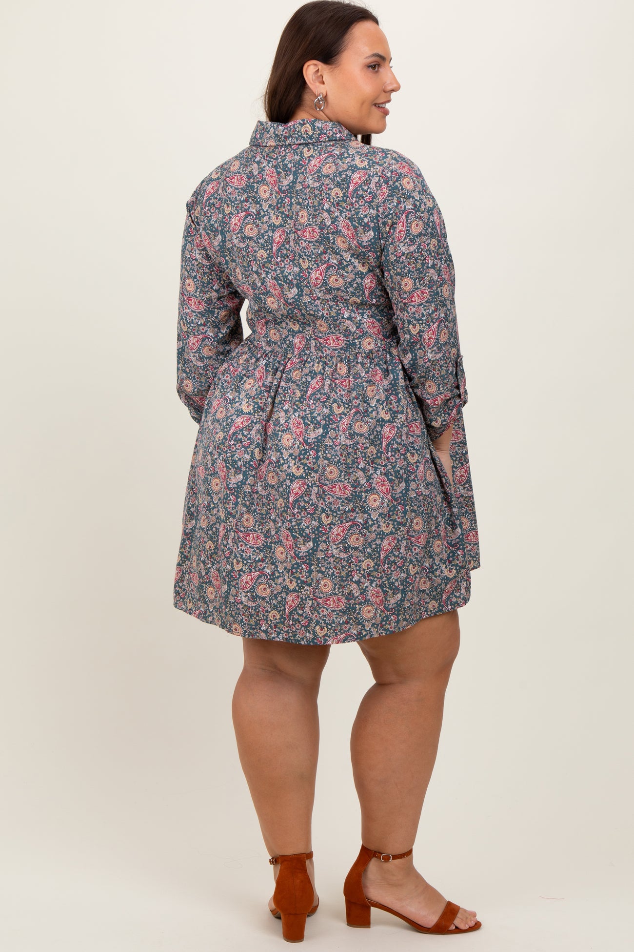 A floral and paisley print plus size dress with a collar, long sleeves, and front functioning buttons.