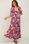 A floral print maxi dress featuring long puff sleeves, a v-neckline, side waist cutouts, and a smocked waist. Body is lined for coverage.