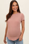A solid ribbed top featuring short sleeves, a curved hem and a rounded neckline.