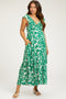 A floral print maternity maxi dress with a wrap v-neckline, short flounce sleeves, and an elastic waistband. Body is fully lined.