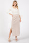 A floral print maternity midi dress featuring a square neckline, short puff sleeves, a smocked bodice, an A-line skirt, side pockets and double lining.