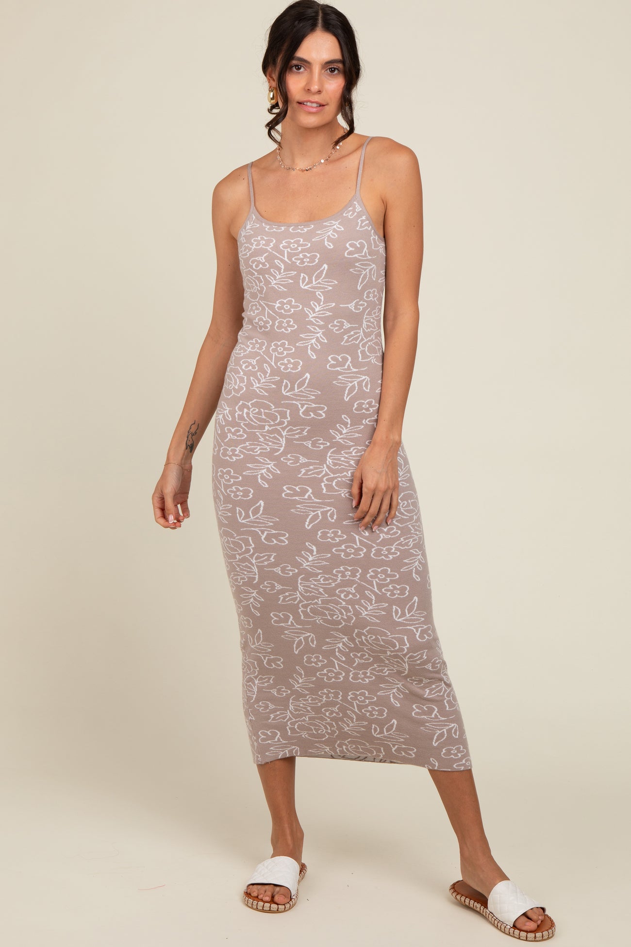 Beige Floral Knit Fitted Maternity Midi Dress