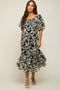 A floral print maternity short sleeve blouse with a smocked neck and flutter cap sleeves.